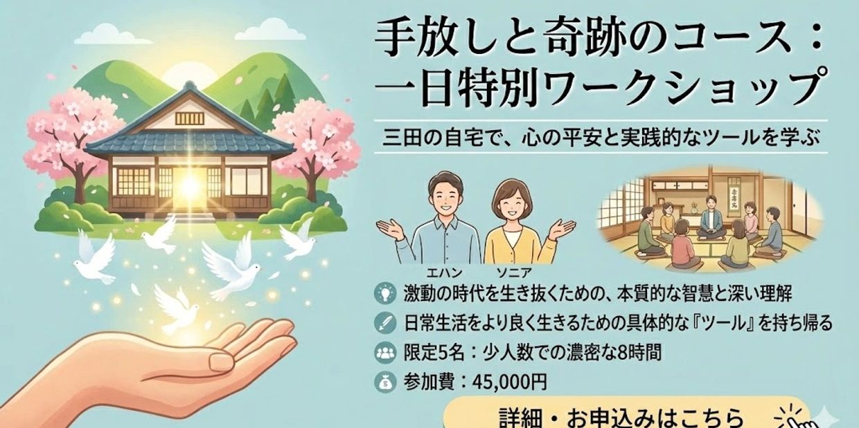 兵庫県三田のエハンの自宅で開催される、1日限りのプレミアムなワークショップです。エハンとソニアが8時間にわたり、「手放し」と「奇跡のコース(ACIM)」の核心を分かち合います。 午前10時からスタートして終了は18時となります。